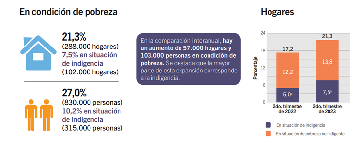 La pobreza y en particular la indigencia alcanzan incidencias de las más altas de la serie iniciada en 2015; solo son superadas en la pandemia. Dentro de los hogares en condición de pobreza, más de un tercio no tiene ingresos suficientes para costear una canasta básica de alimentos (35,4%, frente a 29% en 2022).