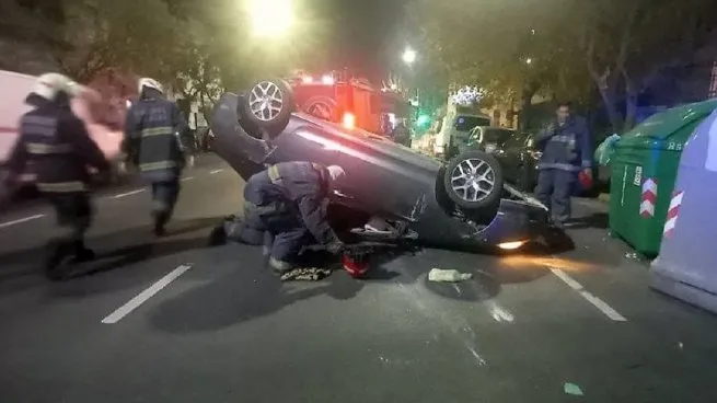 Un automovilista protagonizó un espectacular accidente en el barrio porteño de Caballito, donde chocó, volcó, escapó y dejó a su pareja encerrada en el auto.