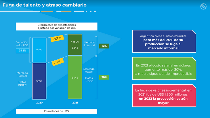 Las exportaciones en economía del conocimiento crecieron 14% interanual en 2021, a u$s 6.442 millones, pero estiman que podrían haber llegado a u$s 8.242 millones anuales, si se contabilizaran las exportaciones del “mercado informal”, estimadas en u$s 1.800 millones para 2021. Para 2022, estiman que las ventas al exterior superarán los u$s 2.400 millones. “Los datos son conservadores, el valor de fuga es incremental, espero que haya alguna política que pueda defendernos”, afirmó Luis Galeazzi, director de Argencon, en una conferencia virtual de la que participó Ámbito.