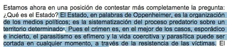 En su columna de opinión, el economista definió al Estado como “en palabras de Oppenheimer, la organización de los medios políticos; es la sistematización del proceso predatorio sobre un territorio determinado. Pues el crimen es, en el mejor de los casos, esporádico e incierto, su parasitismo es efímero y la vida coercitiva y parasitaria puede ser cortada en cualquier momento a través de la resistencia de víctimas”. Ahora bien, si uno revisa el libro Anatomía del Estado, de Murray Rothbard, la explicación es exactamente la misma, sin una coma de más.