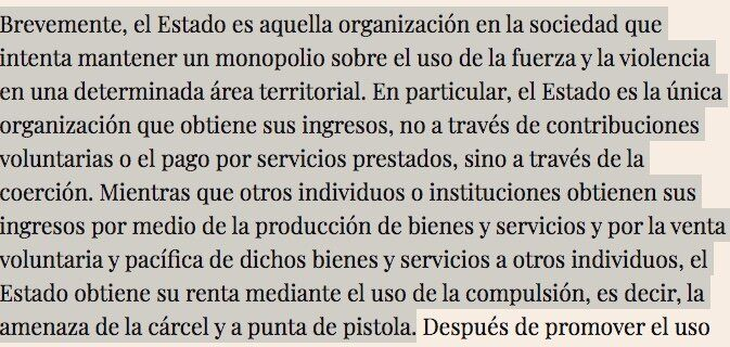 “Brevemente, el Estado es aquella organización en la sociedad que intenta mantener un monopolio sobre el uso de la fuerza y la violencia en una determinada área territorial. En particular, el Estado es la única organización que obtiene sus ingresos, no a través de contribuciones voluntarias o el pago por servicios prestados, sino a través de la coerción. Mientras que otros individuos o instituciones obtienen sus ingresos por medio de la producción de bienes y servicios y por la venta voluntaria y pacífica de dichos bienes y servicios a otros individuos, el Estado obtiene su renta mediante el uso de la compulsión, es decir, la amenaza de la cárcel y a la bayoneta”, textual de la página dos del capítulo 3.
