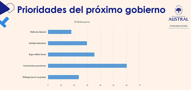 Dentro de las prioridades de la juventud predomina, por diferencia, el crecimiento económico: casi un 50% de los encuestados tiene sus inquietudes puestas en la situación económica y la posibilidad de desarrollarse en este ámbito dentro del país. Bajar el déficit fiscal, reforma laboral, calidad educativa y el diálogo (cerrar la grieta) son otros temas presentes en las respuestas.