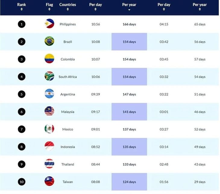 El ranking comienza con Filipinas, donde las personas utilizan el celular 10 horas y 56 minutos, y le sigue Brasil con un promedio de 10 horas y ocho minutos. En tercer lugar, se encuentra Colombia con 10 horas y siete minutos, y el cuarto puesto se lo ganó Sudáfrica con 10 horas y seis minutos.