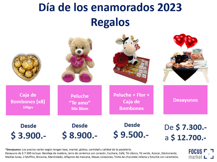 Dentro de los regalos elegidos para el Día de los Enamorados los peluches, bombones y desayunos, siguen siendo los más elegidos. Los precios varían según el tamaño, cantidad y calidad, en cada caso: Bombones x 8 (100 grs.) $3.900, Peluche “Te amo” 50x30cm $8.900, Peluche+Flor+Caja de bombones $9.500, y Desayunos desde $7.300 a $12.700. Los precios varían según tengan taza, mantel, globos, cantidad y calidad de la pastelería.