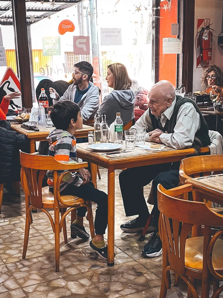 Nicolas Ieraci, periodista, diseñador gráfico, fotógrafo aficionado y filmmaker, almorzaba mesas al lado. En algún momento, vio que a su izquierda cómo un nieto y un abuelo charlaban y se miraban a los ojos. Era la única mesa del restaurante en la que no había celulares. Con el suyo, les sacó una foto infidente: retrató el gesto tierno y la mirada atenta de dos personas que se llevan 74 años de diferencia. A las 13:48 del domingo 7 de agosto de 2022, publicó la imagen en Twitter con una leyenda: “Disfrútalo pibe, disfrútalo mucho. Es el mejor momento de tu vida”.
